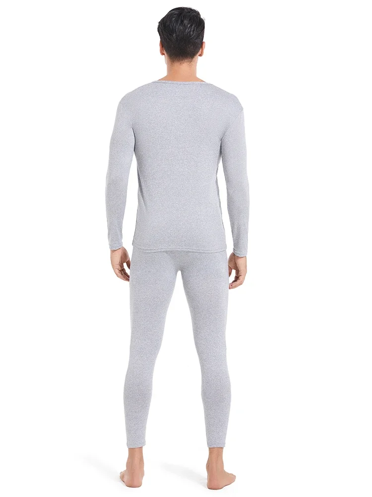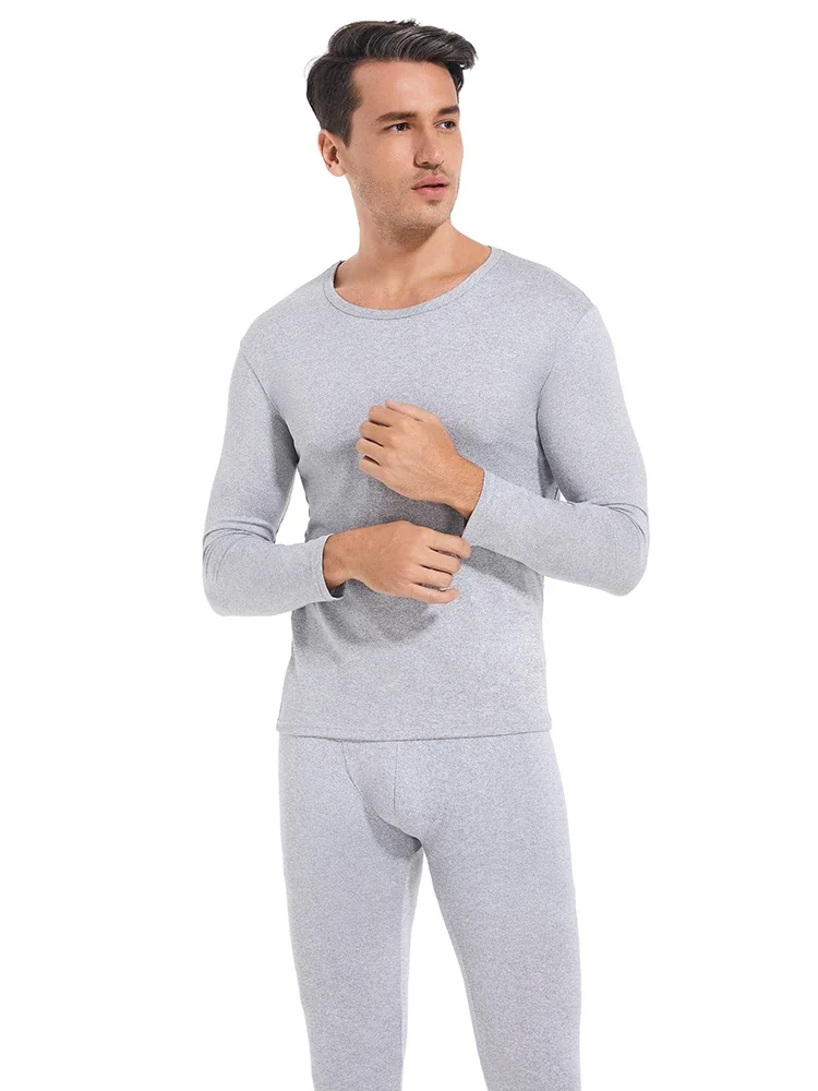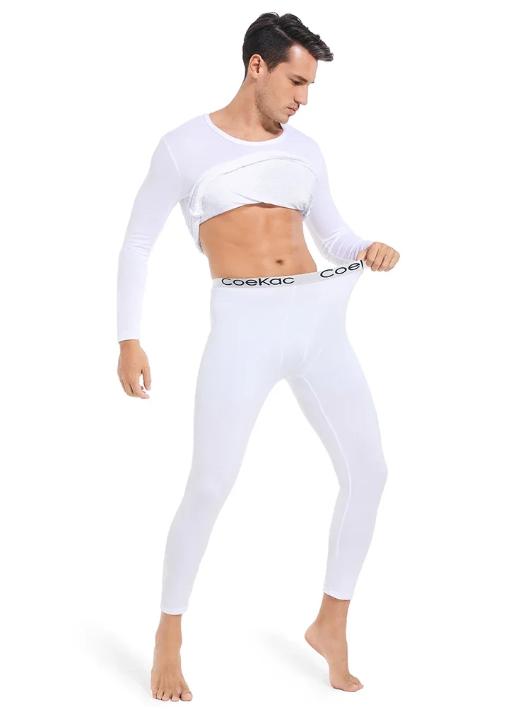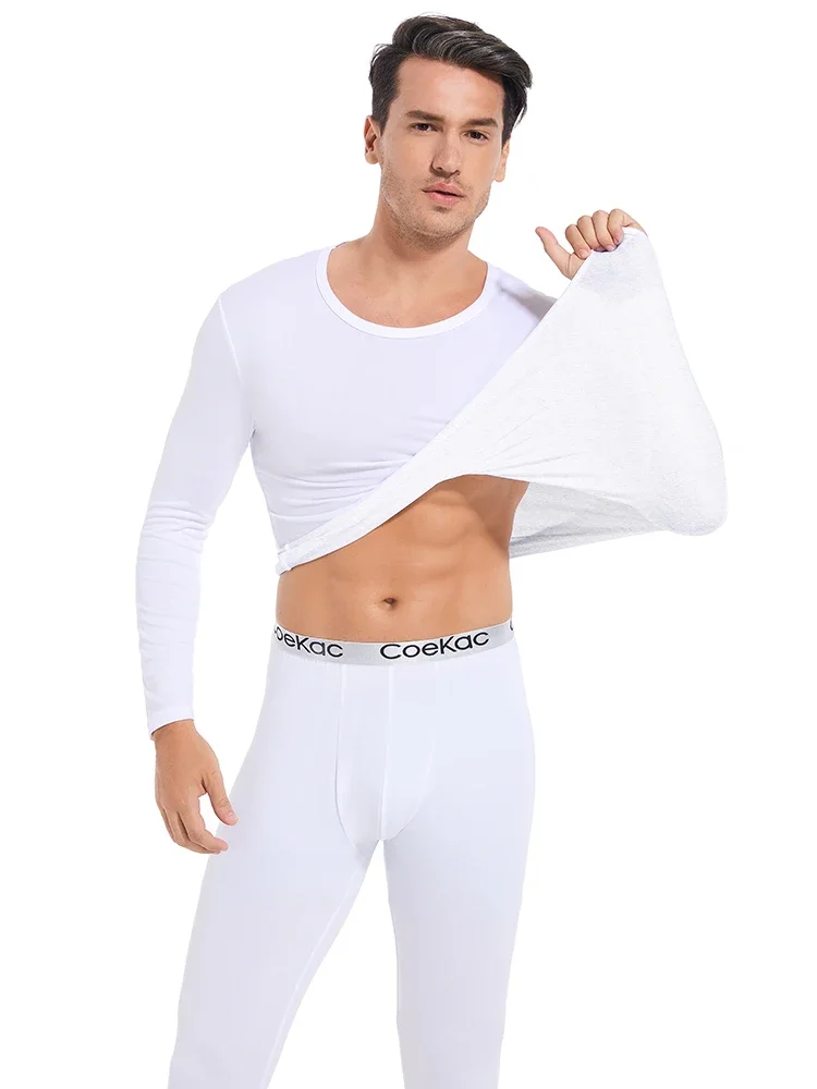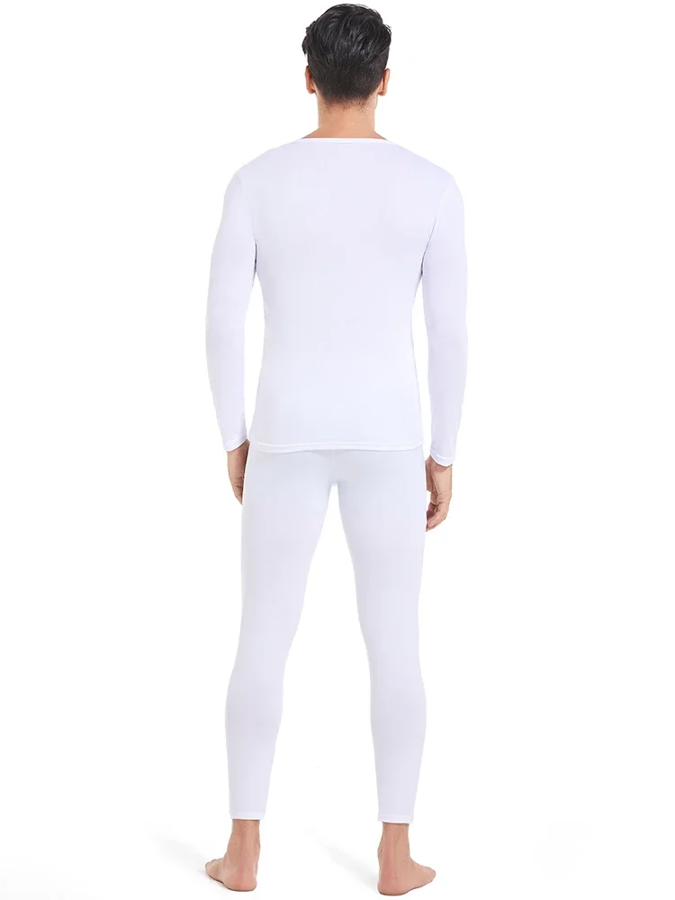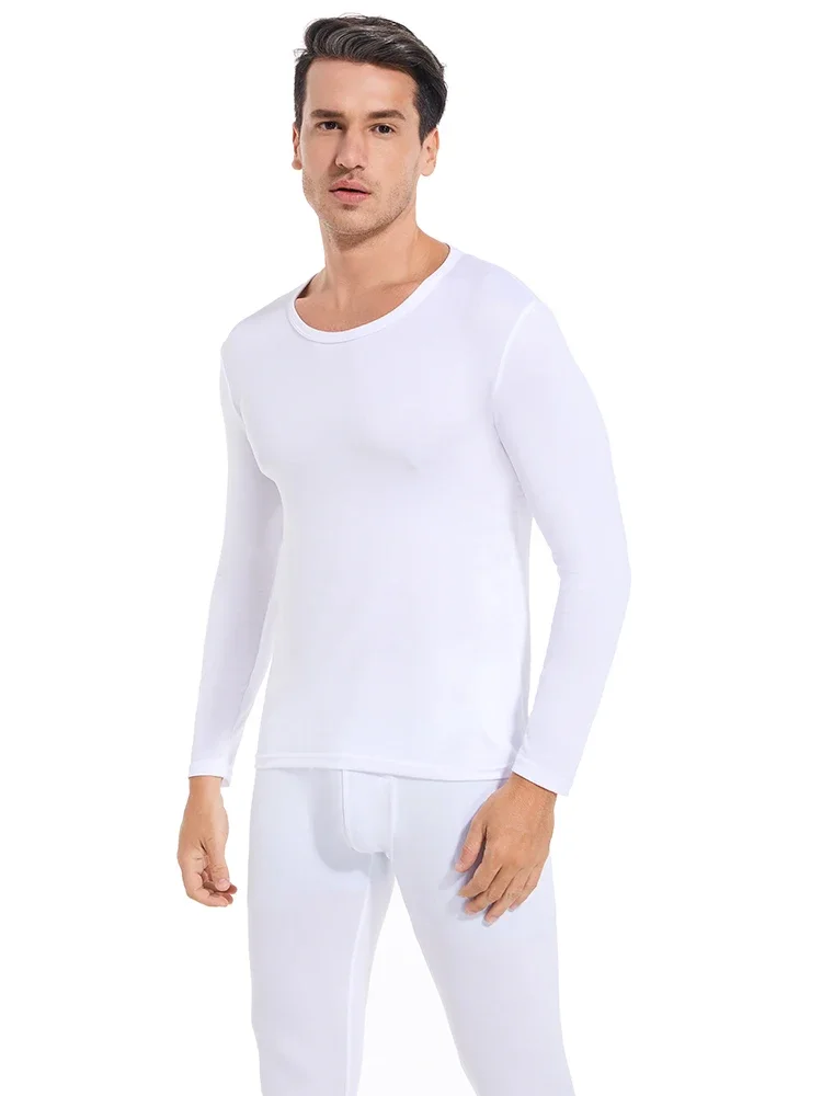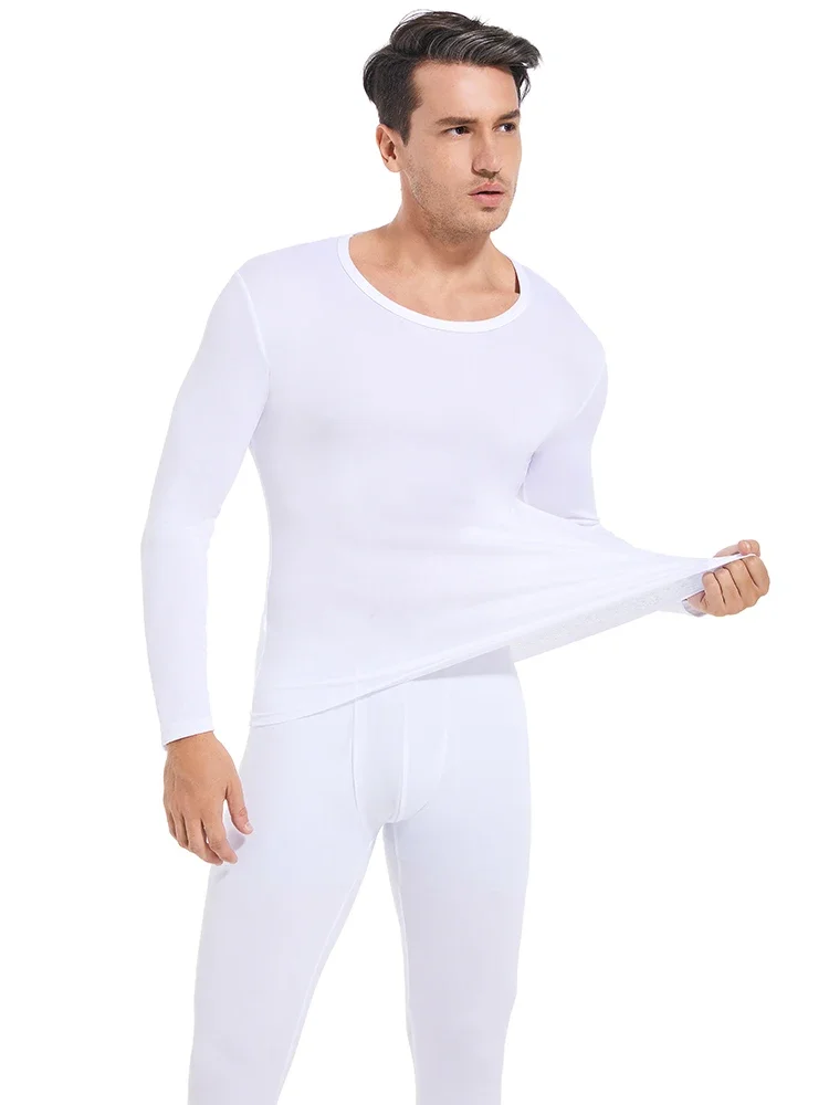 Mens Underwear Winter Long Sleeve Thermal Underwear Thick Fleece T-shirt Round Neck Slim Bottoming Shirt and Pants White