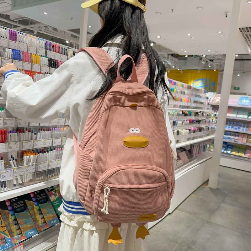 Personalized Kids Backpack Cartoon Duck Corduroy Backpack Aesthetic School bag Large Capacity Cute Plush Bookbag for Teen Girls