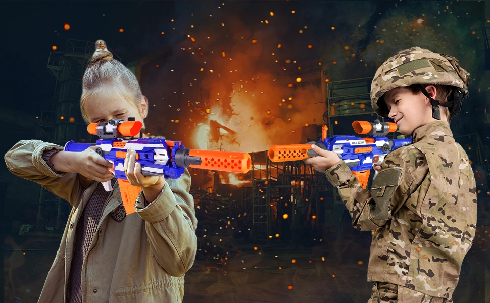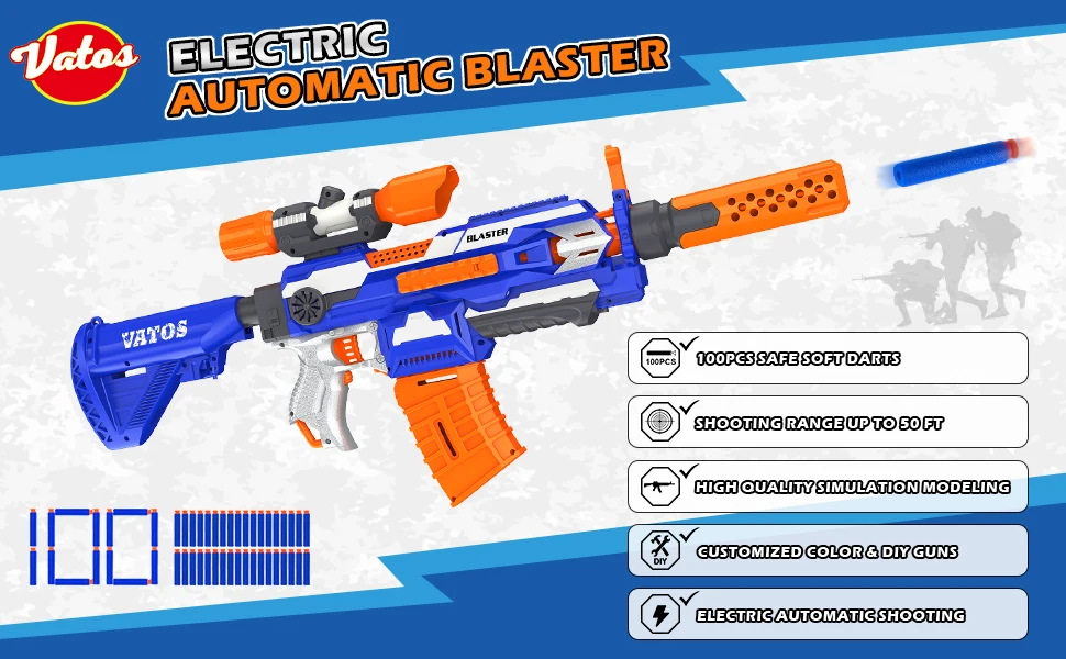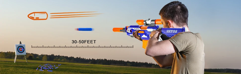 ENDLESS FUN FOR KIDS: With VATOS guns automatic machine gun, kids can play as a cool shooter. Load up soft bullets,aim at the target then shooting, how fun it is!The darts can reach about 30 FT - 50 FT and kids will enjoy hours of fun in this shooting game
