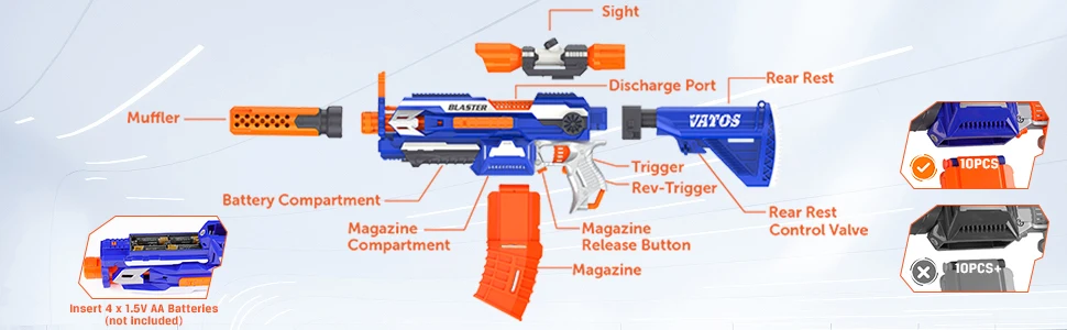 HIGH QUALITY CUSTOMIZATION: Made of high quality plastic materials and manufactured to the highest manufacturing standards, VATOS toy guns for boys 8-12 weighs 915 g and is strong and durable. The dart gun has exquisite workmanship, customized colors and styles, which makes your shotgun cool and unique