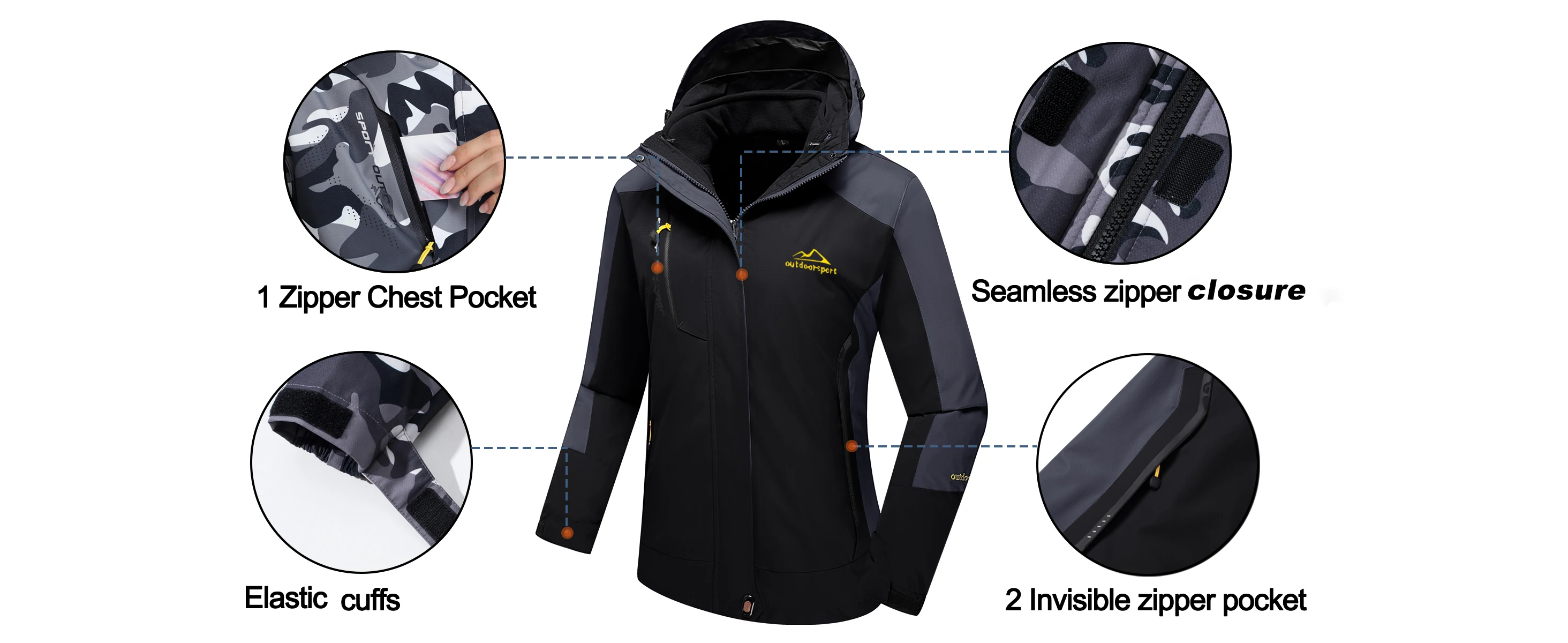 [Material] - Softshell waterproof polyester, Detachable Lining: warm fleece, convertible windproof hood with zipper.